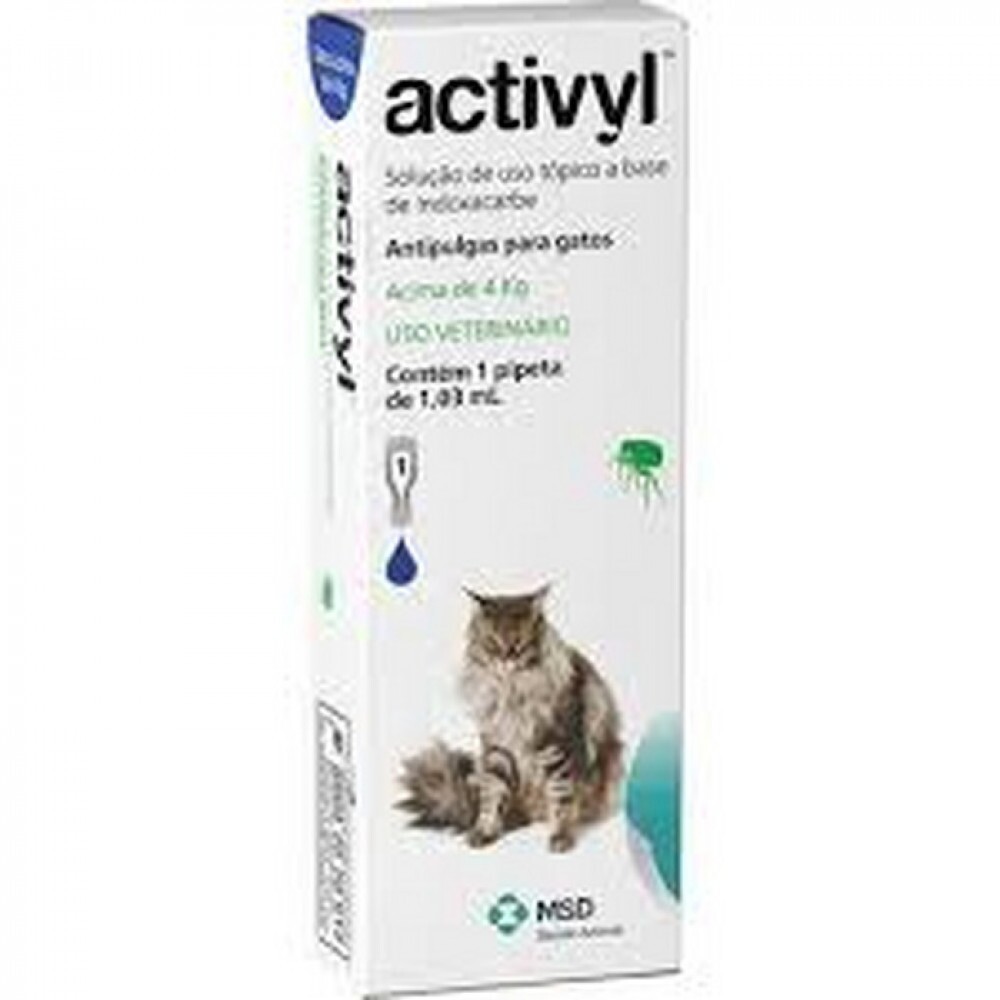 O Antipulgas MSD Activyl 1,03 mL é o único produto no mercado eficaz no tratamento contra pulgas em gatos com a tecnologia de bioativação. Ao contrário da maioria dos antipulgas tópicos disponíveis, a ação inseticida de Activyl acontece no interior da pulga, o que torna o produto ainda mais seguro para animais e proprietários.Indicado no tratamento e prevenção de infestações causadas por pulgas. O produto pode ser utilizado como parte de um esquema de tratamento de dermatite alérgica a picada de pulga (DAPP). As pulgas em estágio de desenvolvimento normalmente presentes nos ambientes onde vivem os animais de estimação, são mortas após o contato com os animais tratados com Activyl.Lave as mãos após a aplicação e evite o contato com as áreas tratadas até estarem secas; use somente as doses corretas recomendadas para o produto, de acordo com o peso do seu pet; deve-se ter cuidado para aplicar o produto em uma área onde o animal não possa lamber e assegurar que os animais não lambam uns aos outros imediatamente após o tratamento; Deve-se ter cuidado para assegurar que o conteúdo da pipeta ou a dose aplicada não entre em contato com os olhos do receptor e/ou de outros animais; estudos demonstraram que Activyl manteve-se eficaz após banhos quinzenais com xampu, imersão em água (natação, banho) e exposição à luz solar. Porém, os animais não devem ser banhados ou tratados com xampu até 48 horas antes e após o tratamento com ACTIVYL™; Restos do produto ou embalagens vazias devem ser descartados de forma adequada, de acordo com as exigências locais.